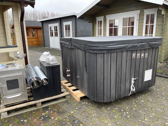Badezuber WPC RECHTECK Whirlpool Hot Tub 172 x 202cm mit externem Ofen inkl. Thermodeckel, Filter-Vorbereitung, Leiter usw.