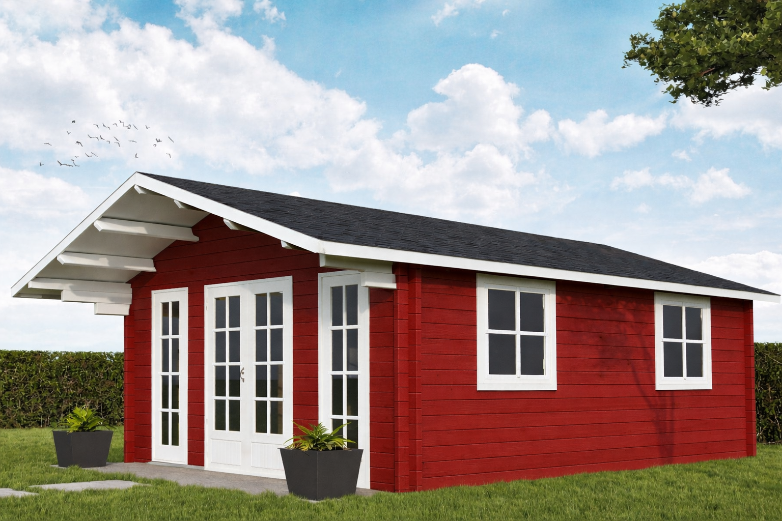 - Das Bild kann in folgenden Punkten vom gekauften Produkt abweichen: Farbe, Metallbeschläge, Schraubenmuster, Dacheindeckung, Dachrinnen, Dekor usw. Dieses Zubehör kann gegen Aufpreis erworben werden. Beachten Sie die Baubeschreibung