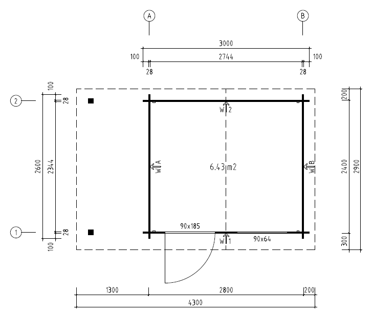 - Bohlenmaß: 3,00 x 2,60m + ca. 1,30m Schleppdach seitlich (links oder rechts)