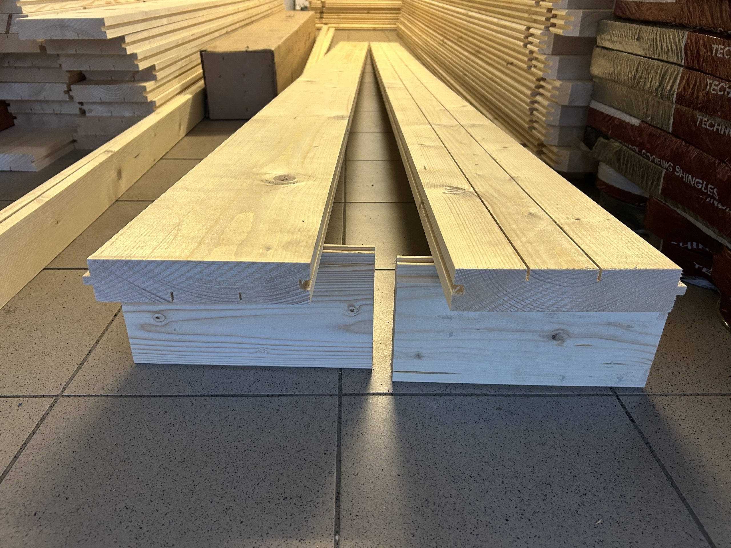 - Wandstärke: 44mm; 2-fach Nut und Feder, Spezial-Chalet-Verbindung